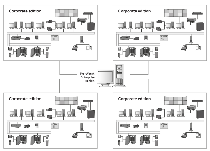 PRO-WATCH ENTERPRISE EDITION: A global security system that integrates multiple Pro-Watch Corporate Edition systems to efficiently manage badge holder data and report on events across the organization. Includes business continuity plans for the security system.